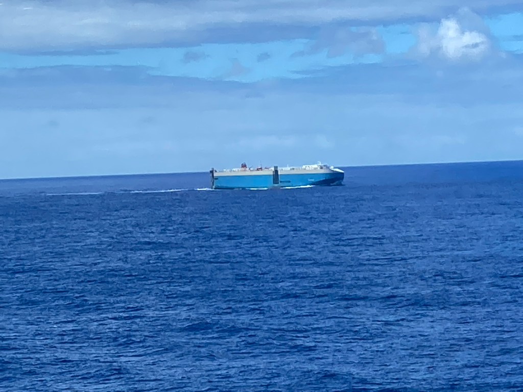The last sea day of our cruise. The sun has come out and the seas are calm. At breakfast this morning we got passed by a car carrier with a rather fetching blue hull.