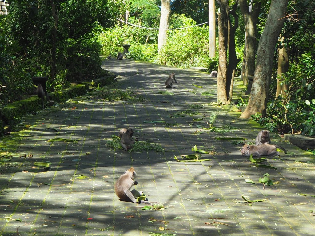There were an awful lot of monkeys in the road ahead and in the trees watching our progress. Any that dared approach, our protector would yell at and wave her rod threateningly. The monkeys would stay just out of reach and bare their teeth at her.