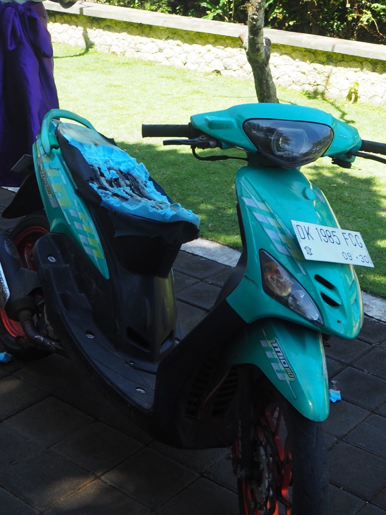 Further along there was another cry of anguish as someone had their glasses taken. We had got around the back of the temple and were heading back to the carpark where we came upon a monkey tearing a motor scooter seat to shreds. All the outer covering had gone and he was systematically tearing the foam off leaving the metal plate beneath. Someone was going to have a very uncomfortable ride home.