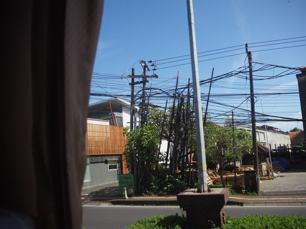 The first thing we noticed is how low the bus roof was. I was bent double and even Jeanette bumped her head on the ceiling. It became obvious why this was the case as we saw the incredibly Heath Robinson electrical distribution system. Even this bus was barely fitting under the power lines that criss crossed the road. A normal bus would have blacked out the entire neighbourhood.
