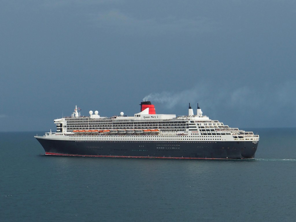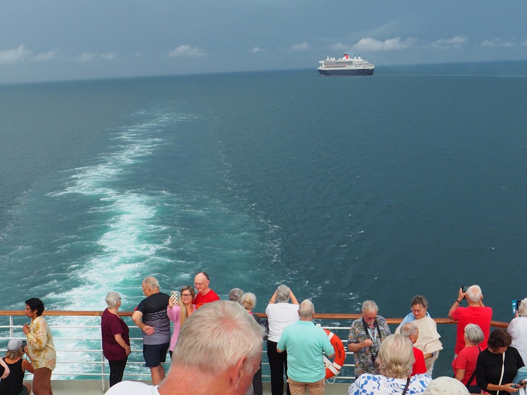 Great excitement on the third sea day of our passage to Airlie Beach. Around 7.15am we were due to pass Queen Mary 2 going in the opposite direction. Alarms were set for early in the morning and everyone was out looking.