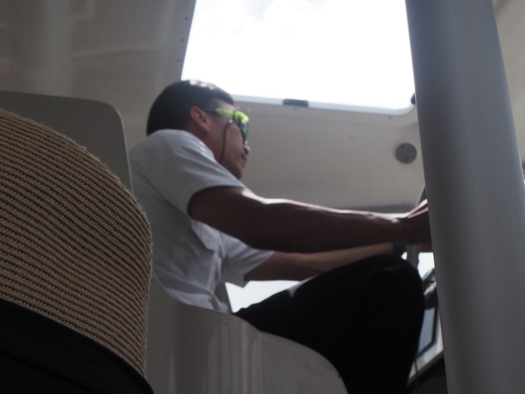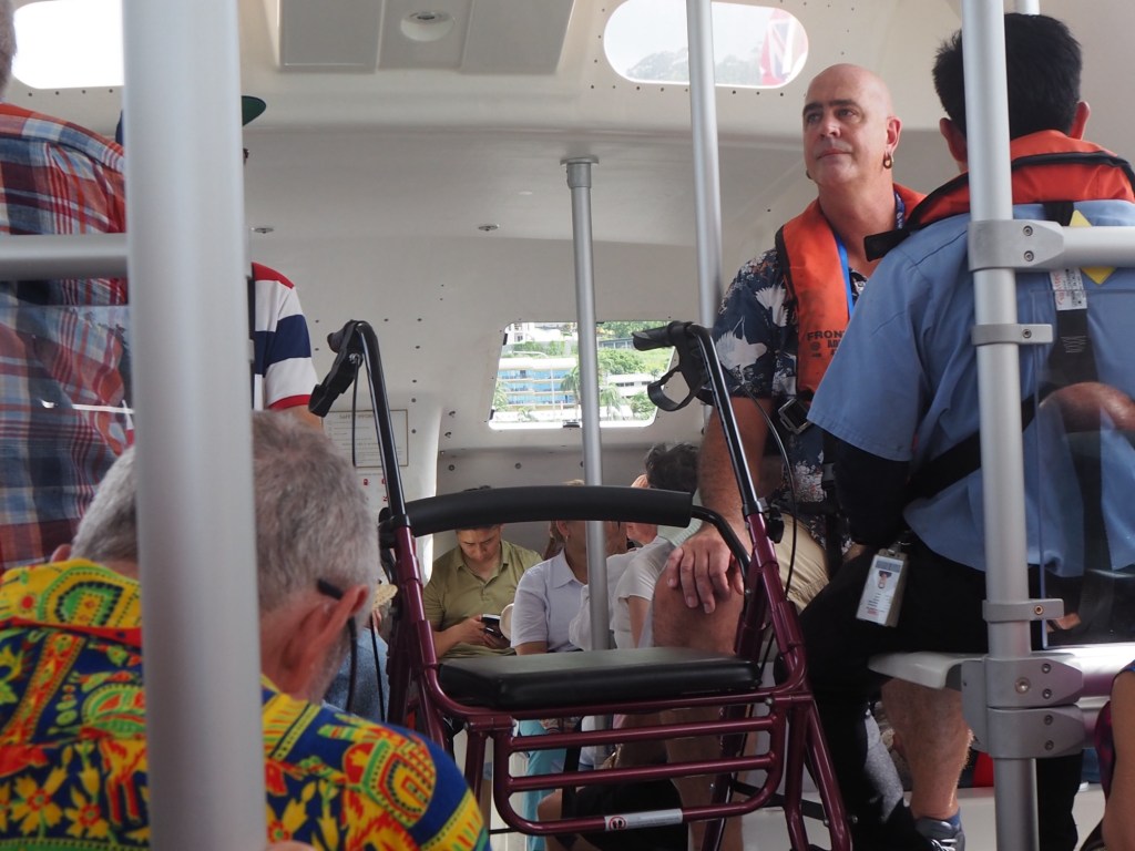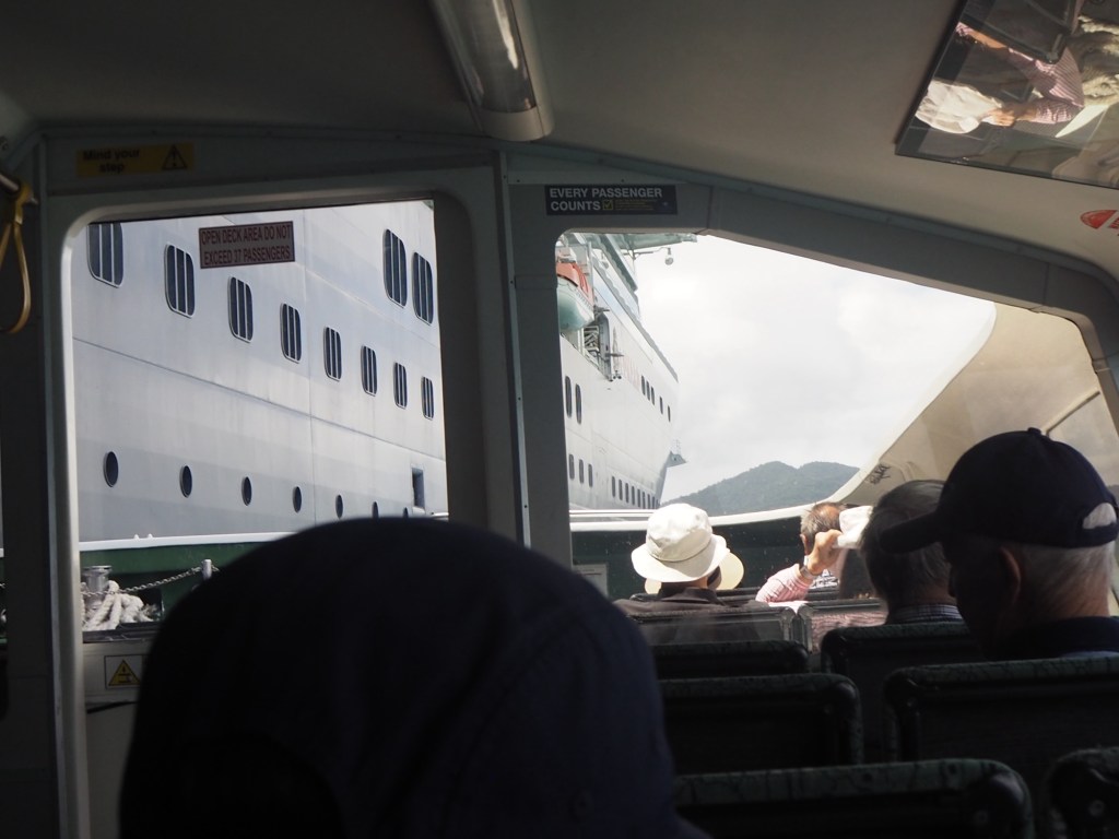We hung on desperately in the sauna-like conditions, wishing the 30 minutes away. However, after the 30 minutes had passed we hadn’t arrived but rather we were going around in circles and the our boat was bobbing around like a cork. The ship’s landing dock was blocked by a large ferry. And after it departed, a large Police boat took its place to evacuate one of the passengers.