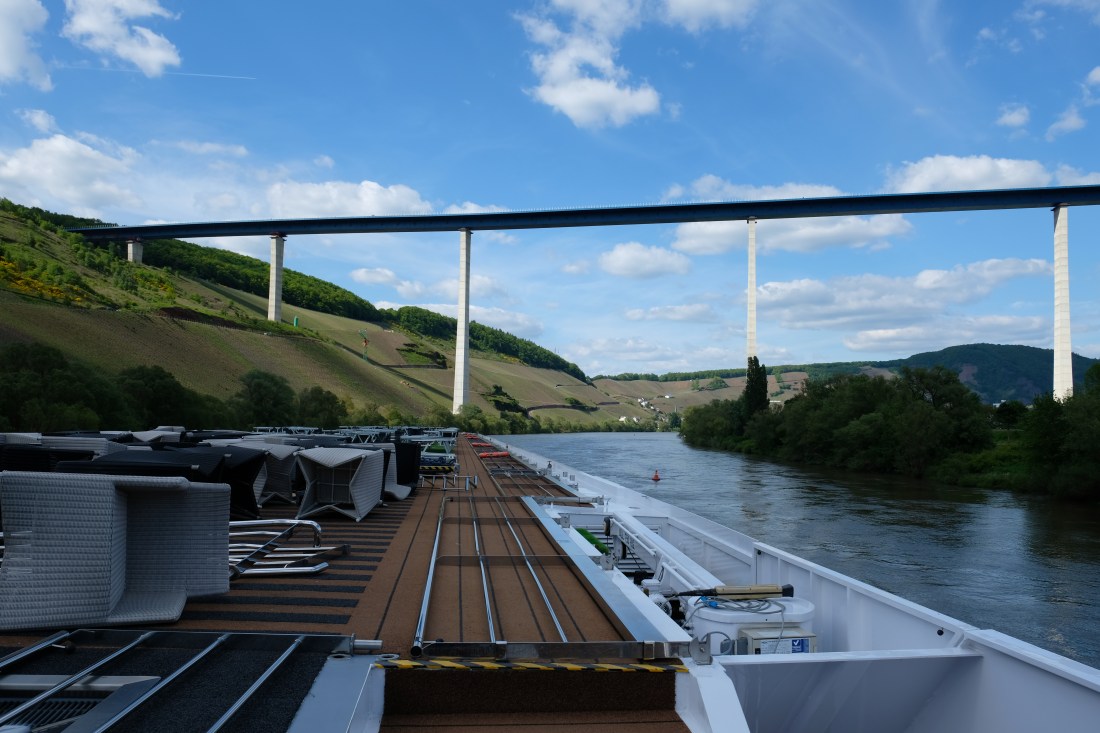 Further down the river, we passed under the Hochmoseluebergang Bridge. This massive structure carrying 4 lanes spans the valley from side to side. It is some 158 meters high and 1.7 kms in length. It is nearing completion and is designed to facilitate trade between Belgium and Germany. You will note from this photo that our top deck has been reduced to minimum height as the river is running some 1 metre above its normal level and we have to squeeze under some of the bridges: just not this one though.