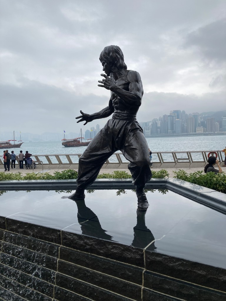 First stop was the Middle Road Park which is high above the road looking out toward the Harbour. It has an extensive collection of playgrounds for young children and was already busy with littlies running everywhere. I walked on to a platform looking out over the water and saw below the promenade where there is an Avenue of movie stars – this was my planned first stop. I found a statue of Bruce Lee and other Chinese movie stars totally unfamiliar to me, but it was a pleasant walk along the harbour’s edge. It was incredibly misty and difficult to see across to Hong Kong Island.