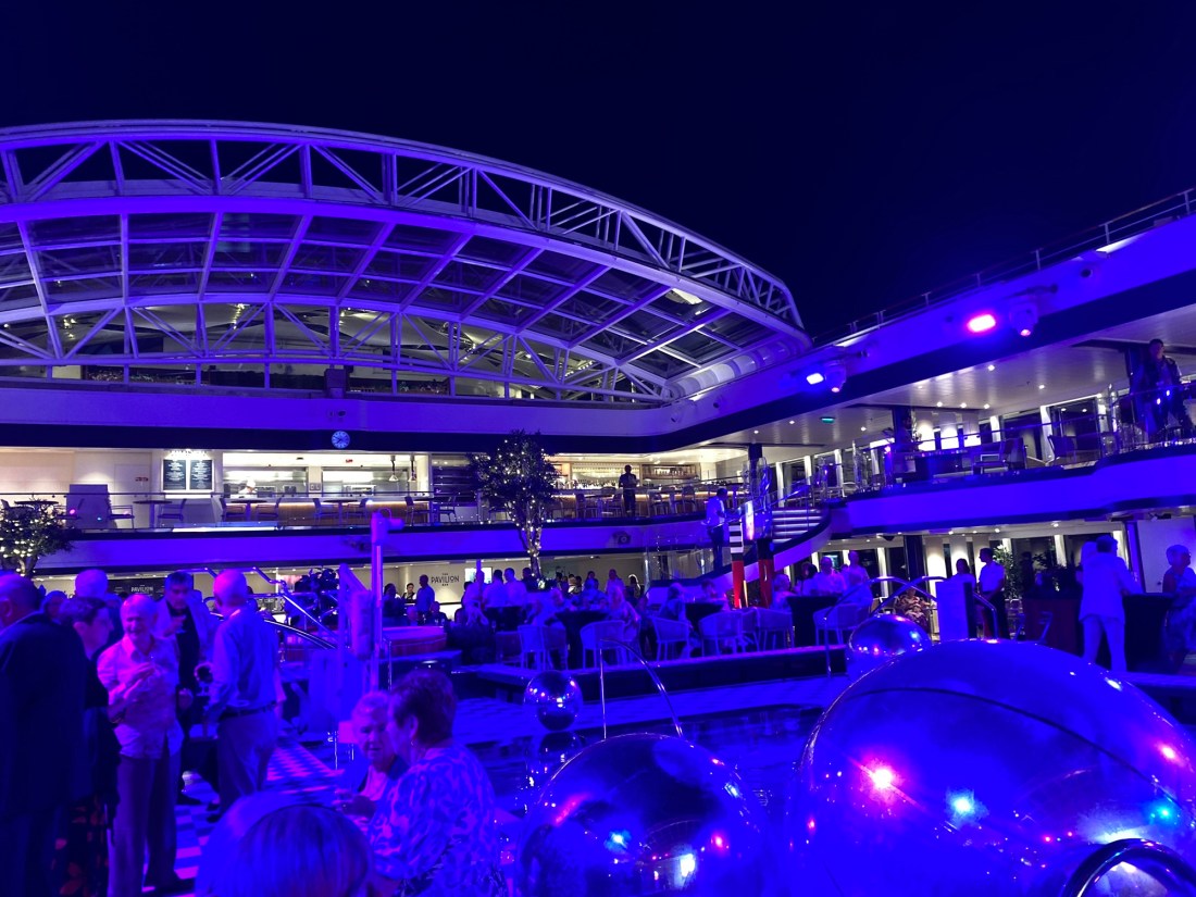 This evening we had an invite to the Captains party in the Pavillion . This is an area where the swimming pool is located so its roof was open to the sky. Now to my mind this was not a particularly attractive area, but at night it looked rather impressive; all the partially clad, wrinkly, overweight elderly bodies that usually fill this area having decamped presumably to the all you can eat Buffett.