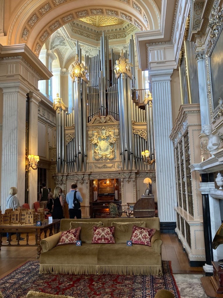 Our guide told us a place can only be called a palace if it belongs to royalty or a religious purpose ie a Pope’s or Bishop’s palace. Blenheim is very much owned by royalty and the Churchills, although living and maintaining Blenheim, pay rent to King Charles for the pleasure. It is a magnificent place filled with the most beautiful artworks, furnishings, and other fine fittings. The huge Library even has a large pipe organ at one end!