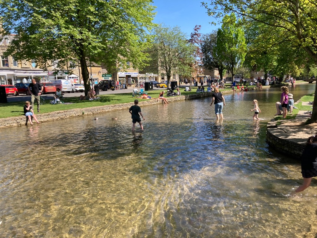 Then we drove on to Bourton on the Water for a lunch break. It is a dear little town in the Cotswolds which has a shallow manmade stream running through it, with five little bridges, very close together, to cross it. Sheep were the main activity in this area in earlier times and the stream was created to provide a place for the women to wash the fleeces. Today it is more like a little water playground for visitors.